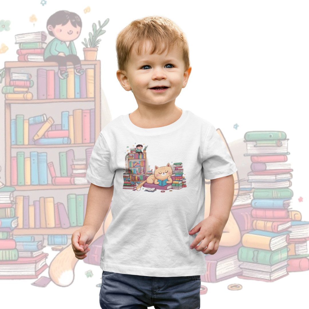 "Dê asas à imaginação do seu pequeno explorador com nossa camiseta 'Aventuras Literárias Felinas'. Apresentando um gato irresistivelmente fofo imerso em seu livro favorito, esta camiseta é a escolha perfeita para os pequenos amantes da leitura.